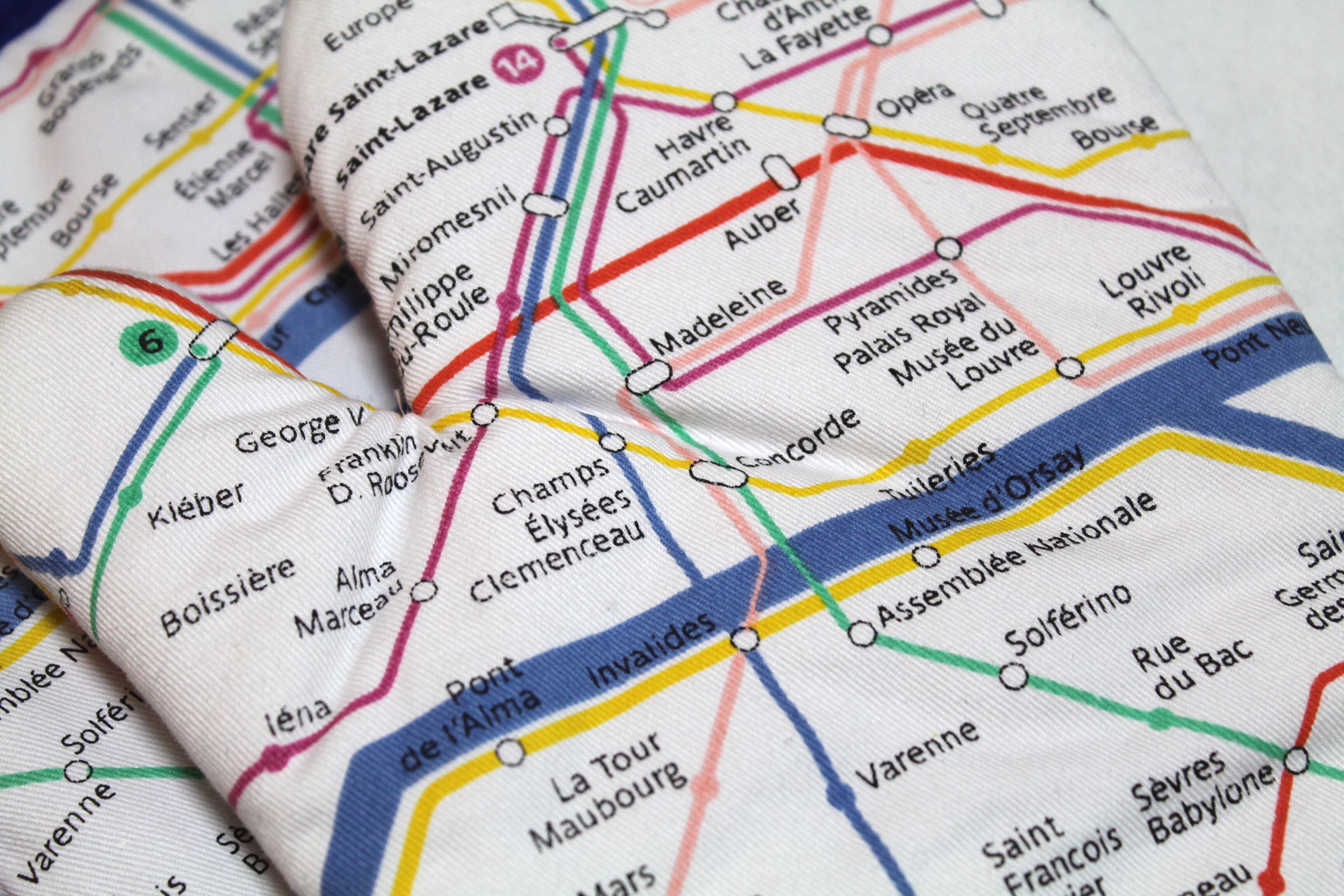 パリのメトロ路線図が描かれてた、オーブンミトンと鍋敷きのセットです。